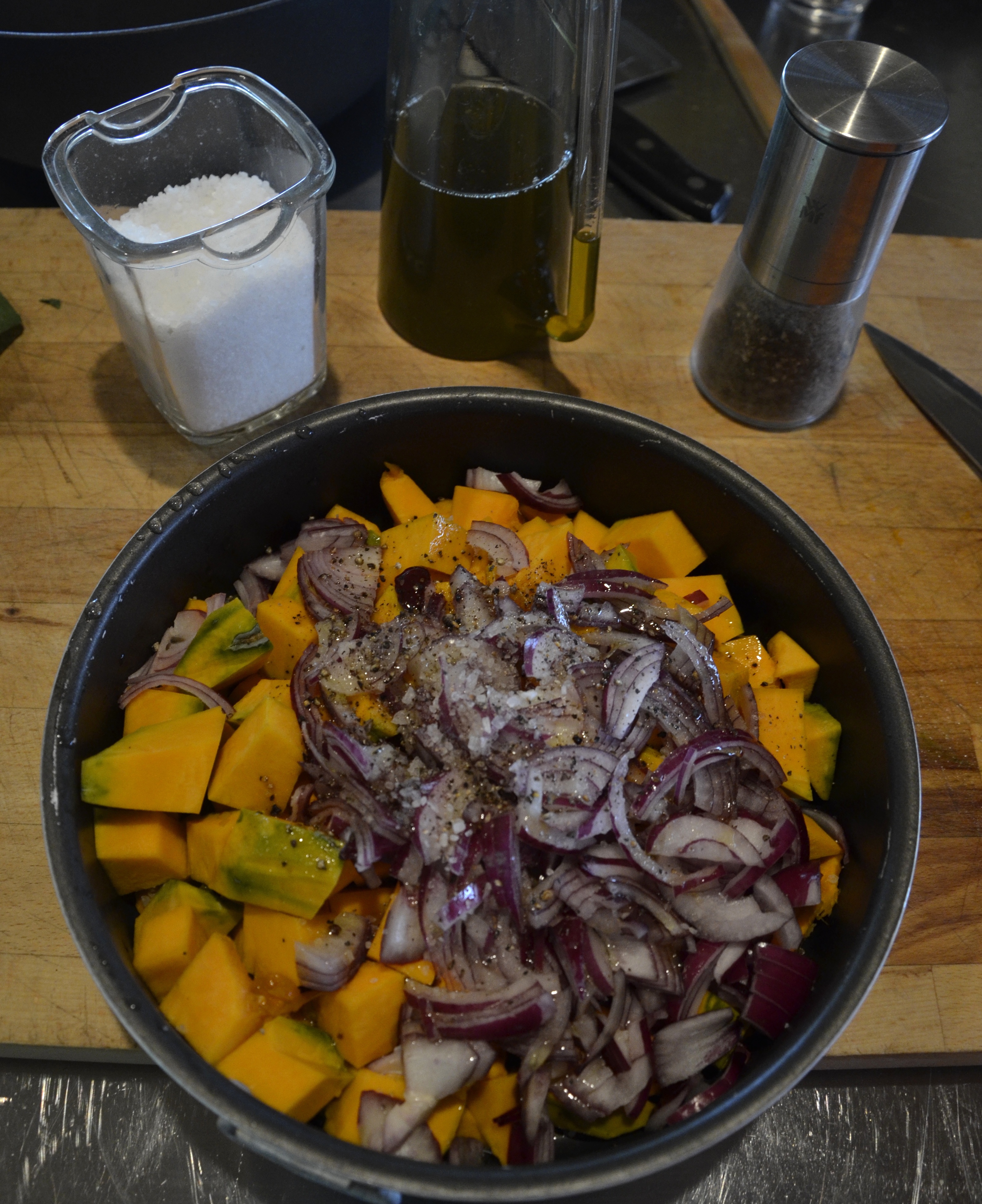 Turn the oven on 375 degrees. take the skin off of the pumpkin and cut in 1 inch pieces. chop the onion into slices. put the vegetables into an oven pan and mix well with the olive oil, coarse salt and pepper, cover with foil and cook for 30 minutes covered and other 10 minutes uncovered. the pumpkin will be ready when a fork can easily smash into it.
