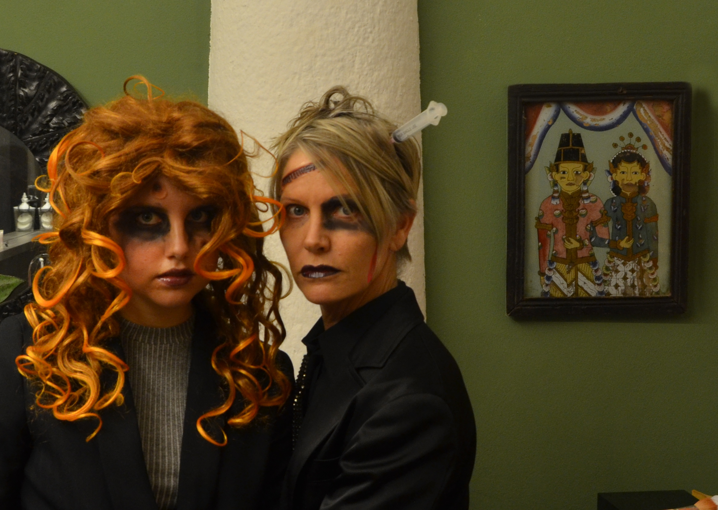 Happy late Halloween! last night I prepared a mung bean-carrot-feta cheese salad for a big dinner party. the dish was a success, but most importantly a lot of the prepping time was focused on the dressing up part. My mom picked up some weird and disgusting looking pimples and marks to put on your face. She also had a fake syringe put on her head. And I improvised some black make up too. It’s seems like the last time I dressed up like that was about 10 years ago, Hahaha! It was real fun, also to see the people’s reactions outside on the streets.