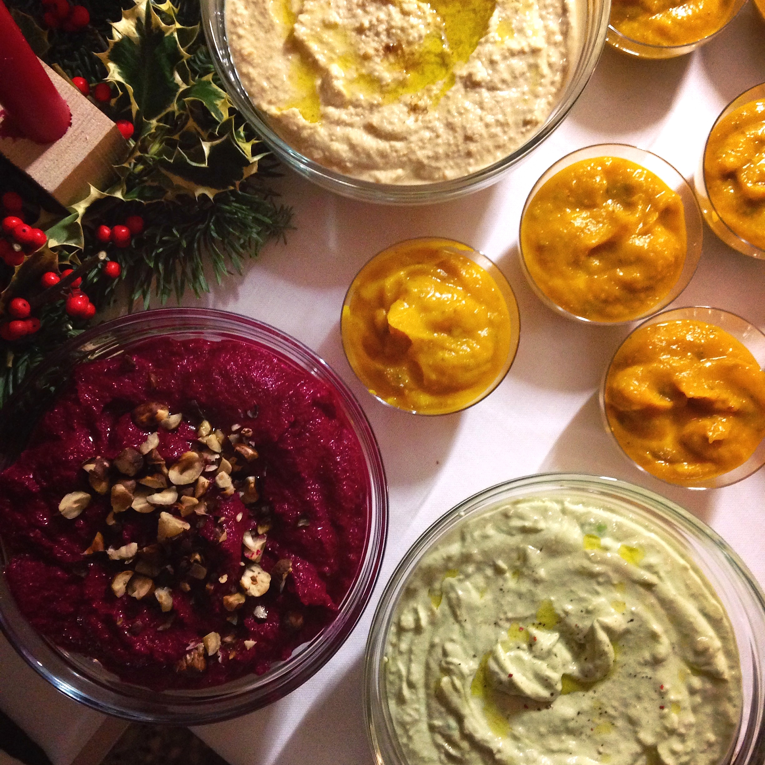 These were the three dips and the pumpkin soup served in small cups: